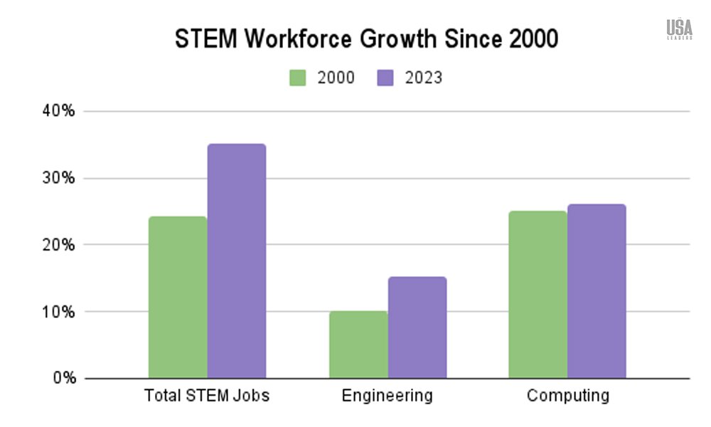 Female STEM participation increased from 24% in 2000 to 35% in 2023. This represents major progress, but gaps remain in leadership and emerging tech.